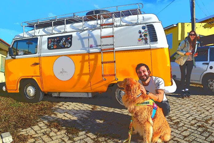 Rhaman viaja a bordo de uma Kombi reformada, equipada com cama, fogão, geladeira, forno e até chuveiro com água quente. Mas o que chama atenção mesmo é a companhia inseparável: Hoi An, sua Golden Retriever — carinhosamente chamada de “minha terapia que vive abanando o rabo”.