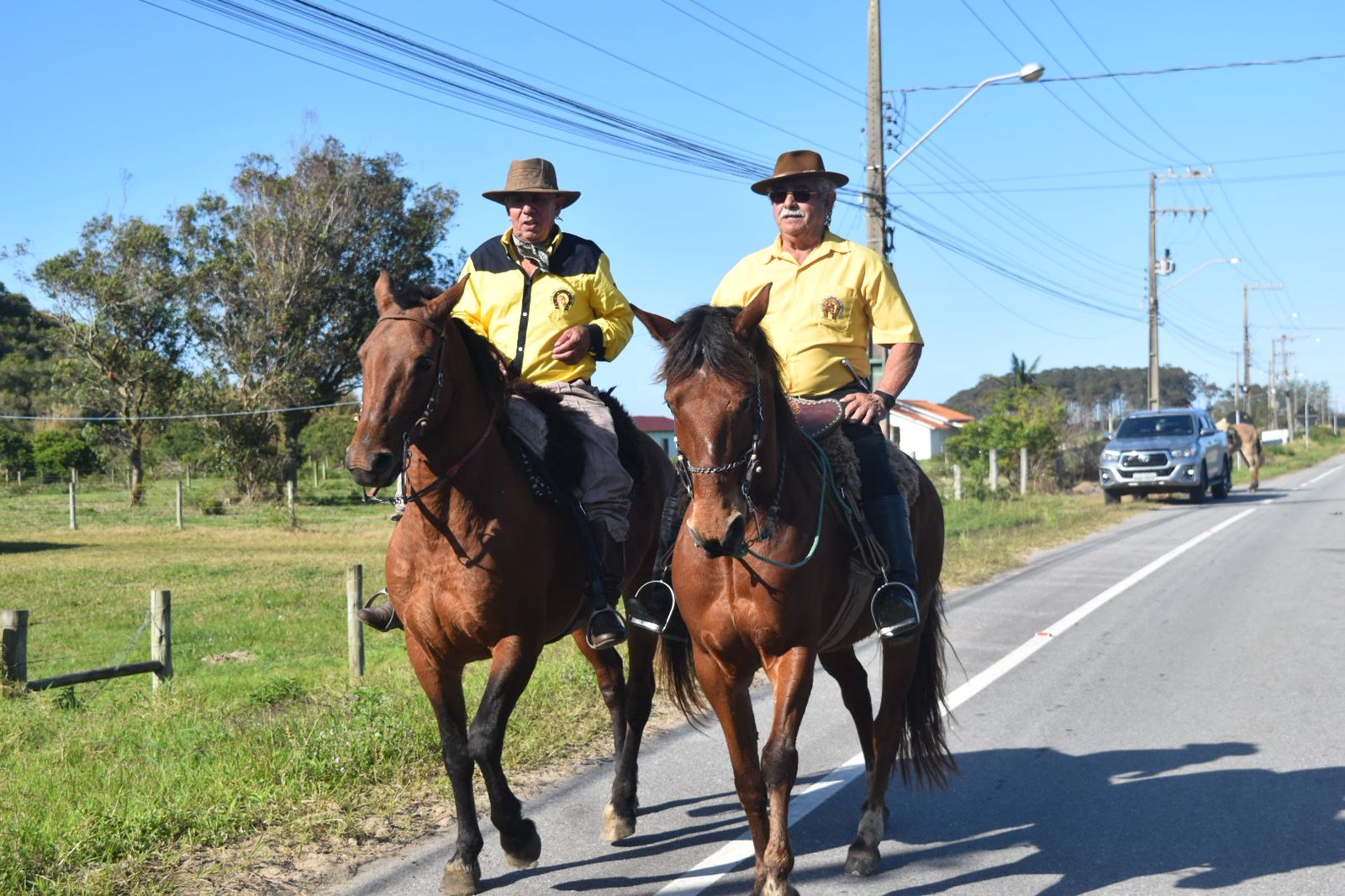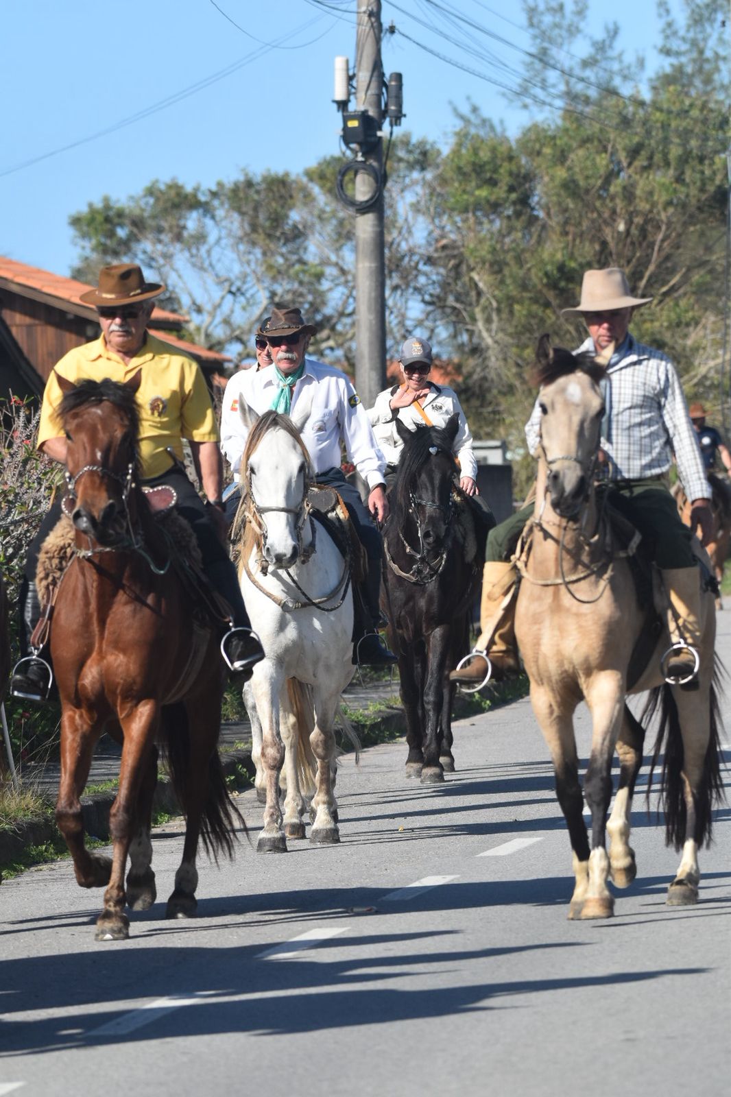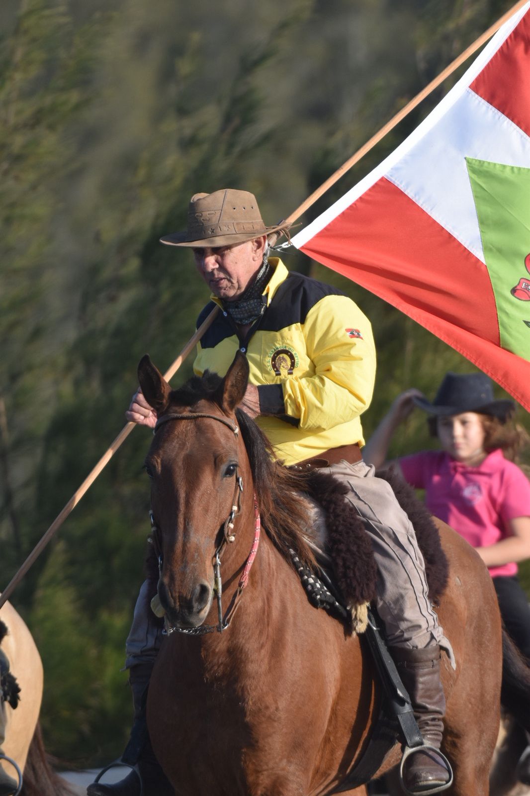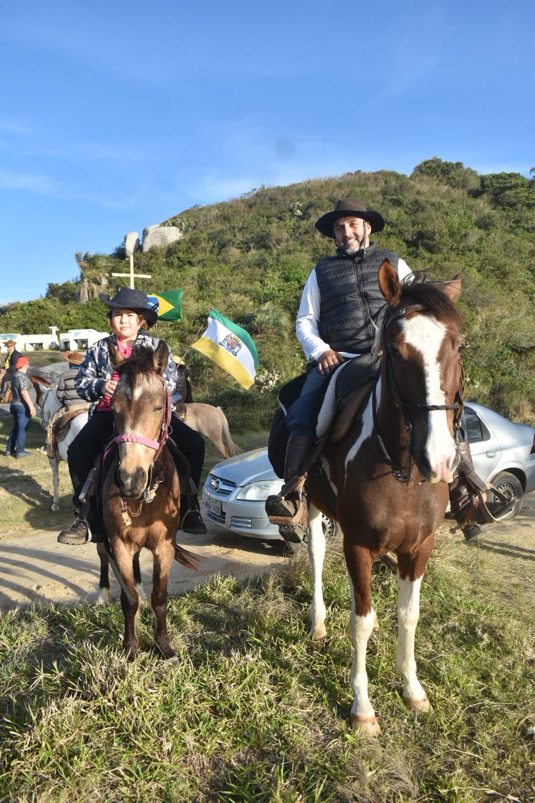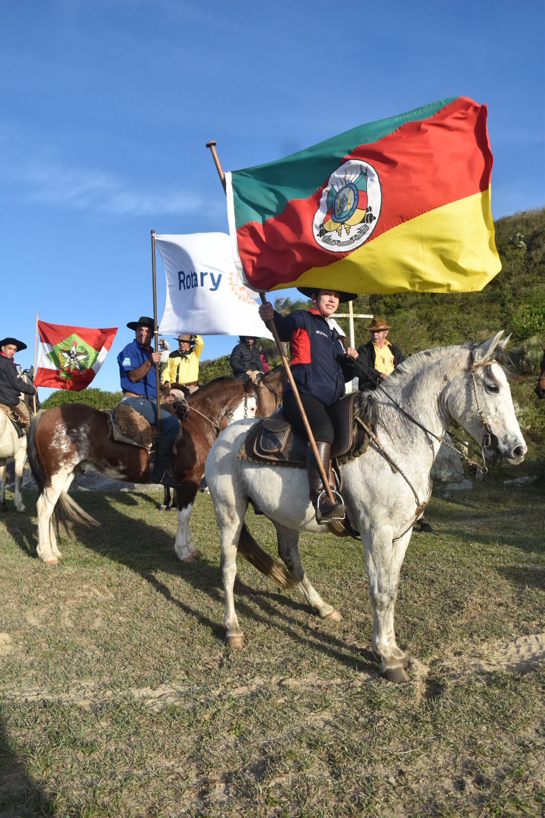 No sábado pela manhã, dezenas de cavaleiros se reuniram na Praia da Tereza em uma cavalgada marcante. Montados e trajados com orgulho, os tradicionalistas seguiram juntos, carregando as bandeiras de Santa Catarina, Rio Grande do Sul, Anita Garibaldi e Rotary, em um cortejo que emocionou quem acompanhava o percurso.